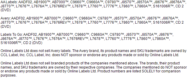 FMF - Friends of Minerals Forum, discussion and message board Note: I need for the labels to be small and square or rectangular. The Avery labels mentioned above are about 2 x 1 cm and 1 x 1 cm might even be better [but can't find any] - 15 mm x 7,5-10 mm might even be better - but small is the key word and on small specimens I can cut down as needed. On larger specimens it is not such a problem. Avery Zweckform Druckeretiketten online kaufen | shopwelt.de Avery CD/DVD Labels, Classic size Ø 117mm (25) ... Avery White Full Face CD/DVD Label - Laser - L7676. Farbe: Weiß, Drucktechnik: Laser. 11,18 € - 20,93 € ... CD Labels, DVD Labels in Stock - ULINE Uline stocks a wide selection of CD/DVD Labels. Order by 6 p.m. for same day shipping. Huge Catalog! Over 40,000 products in stock. 12 Locations across USA, Canada and Mexico for fast delivery of CD/DVD Labels.