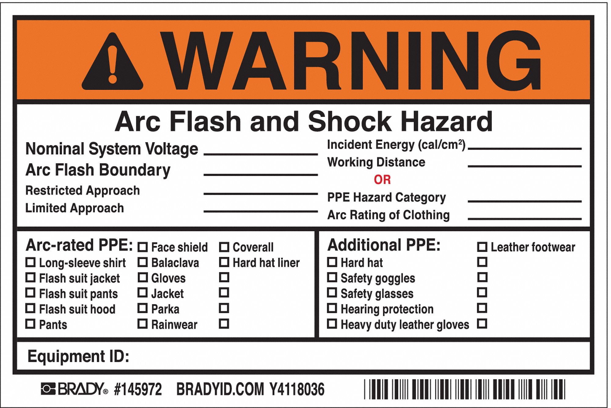 Arc Flash Labels | Arc Flash Warning Labels & Stickers | BRADY Arc Flash Labels identify potential hazards with energized switch boards, panel boards, control panels and much more. Standard arc flash labels are available with either "Warning" or "Danger" headers. ... 710 Cochrane Drive, Markham ON Canada L3R 5N7 Phone: 1-800-263-6179 Fax: 1-800-387-4935 Hours: 7:30am - 5:00pm EST Monday - Friday.
